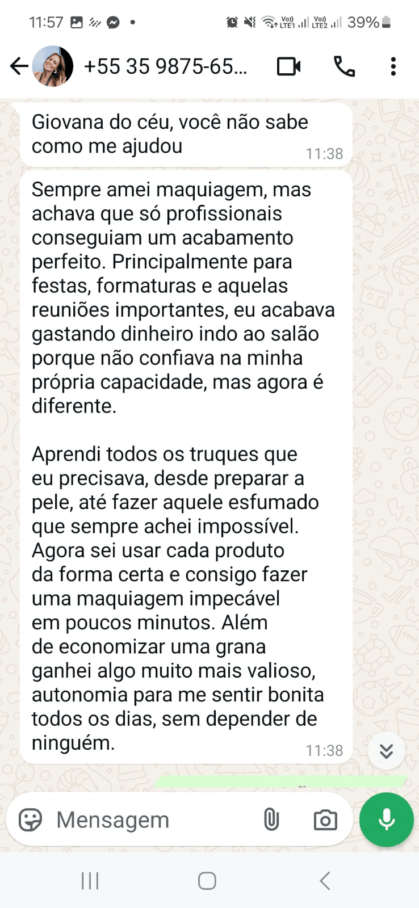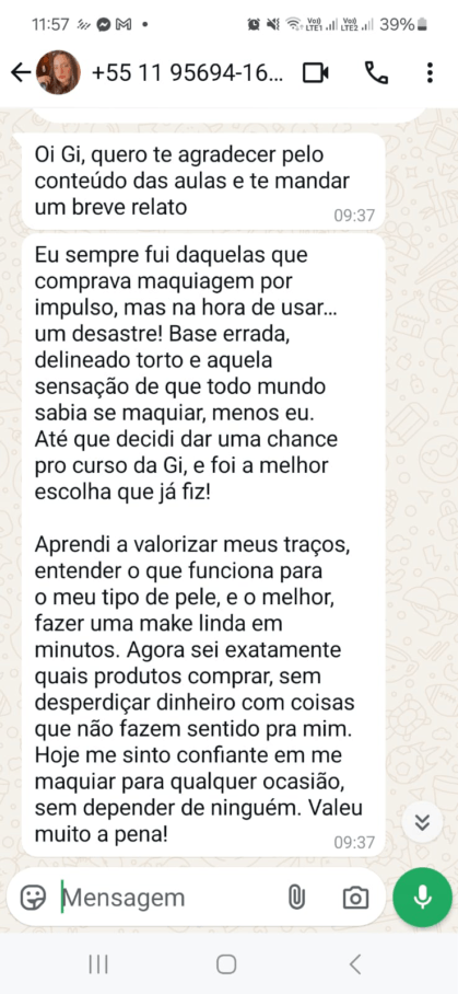 Além de colocar a mão na massa como maquiadora, Giovanna também compartilhou seu conhecimento dando aulas presenciais de automaquiagem, ajudando centenas de pessoas a explorarem sua própria beleza. Agora, todo esse conhecimento está reunido em um curso online direto ao ponto! Não é só sobre aprender técnicas de maquiagem: Giovanna te ensina a valorizar o formato do seu rosto, a escolher as cores certas, a entender sua pele e, claro, a brilhar onde quer que você vá.